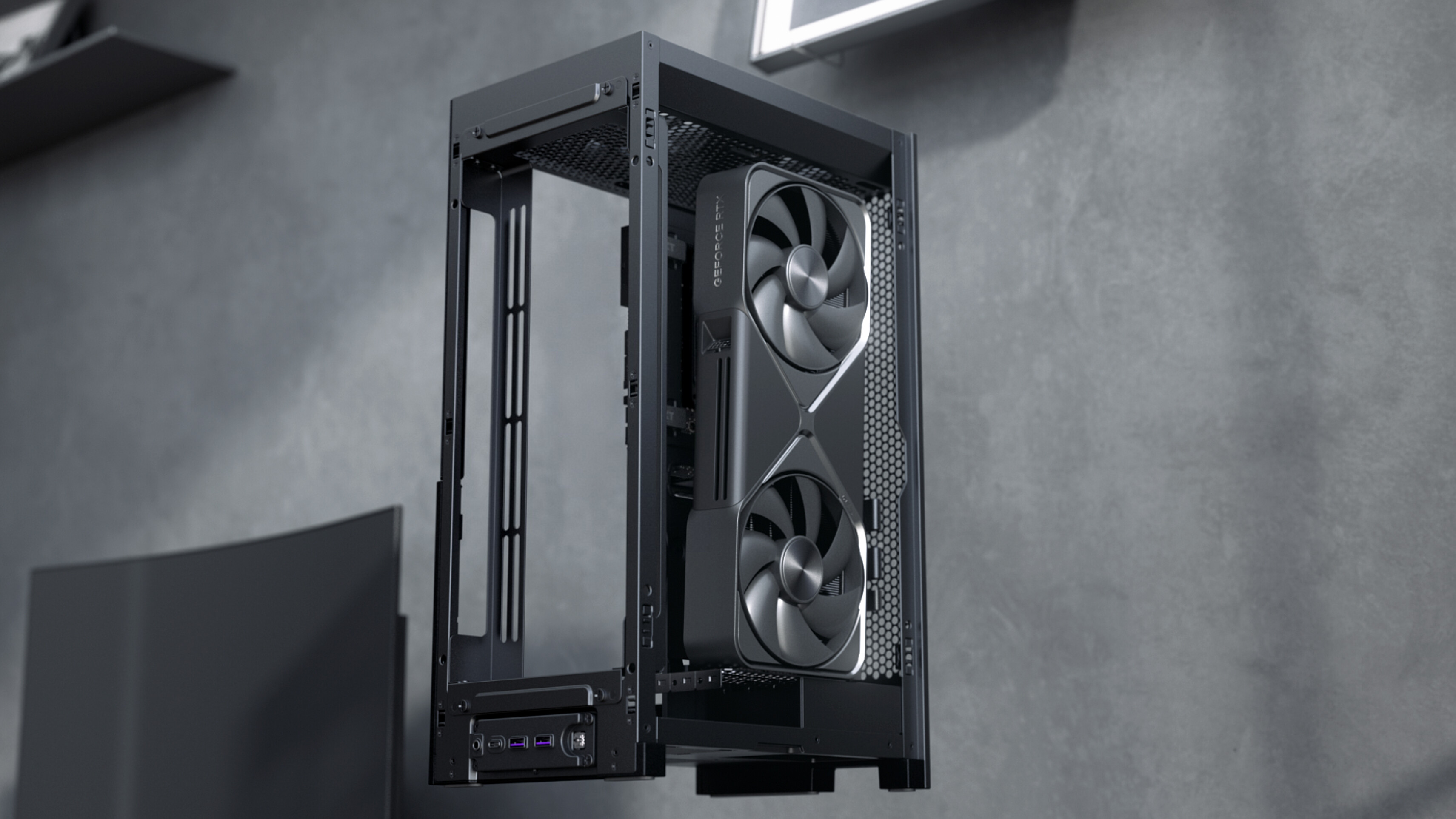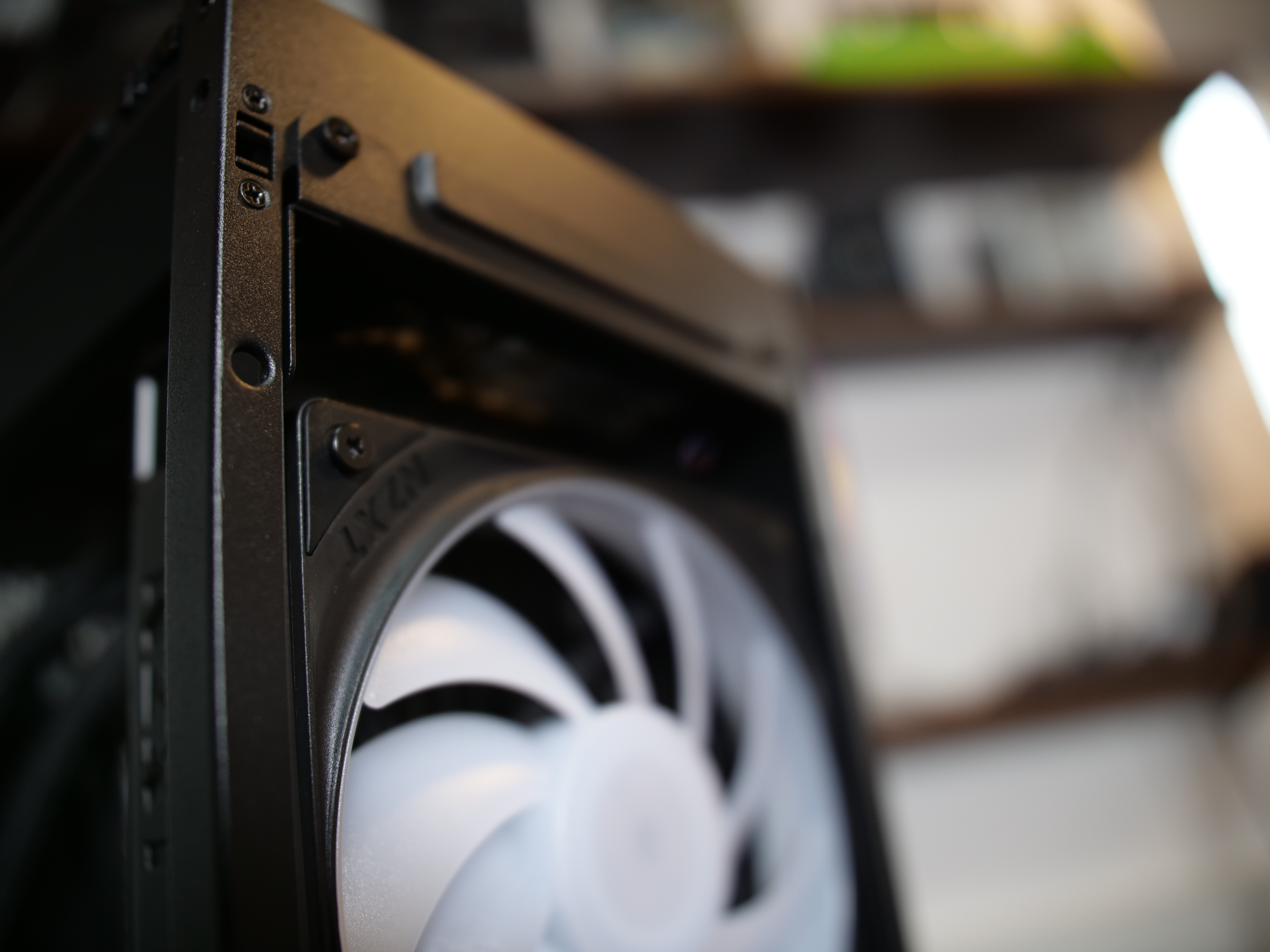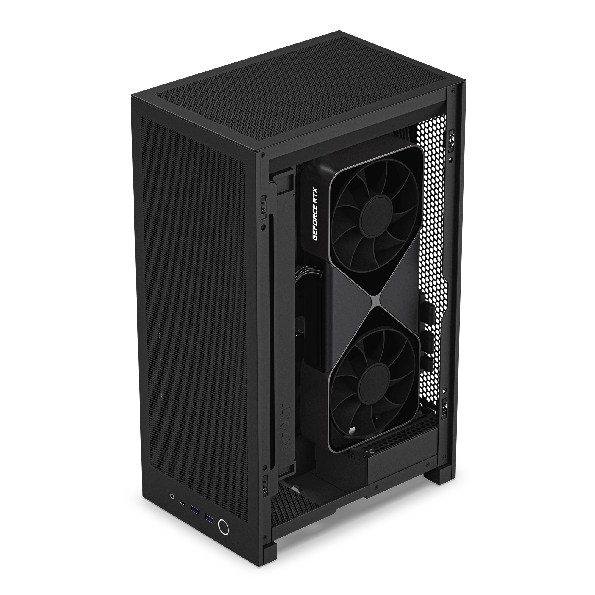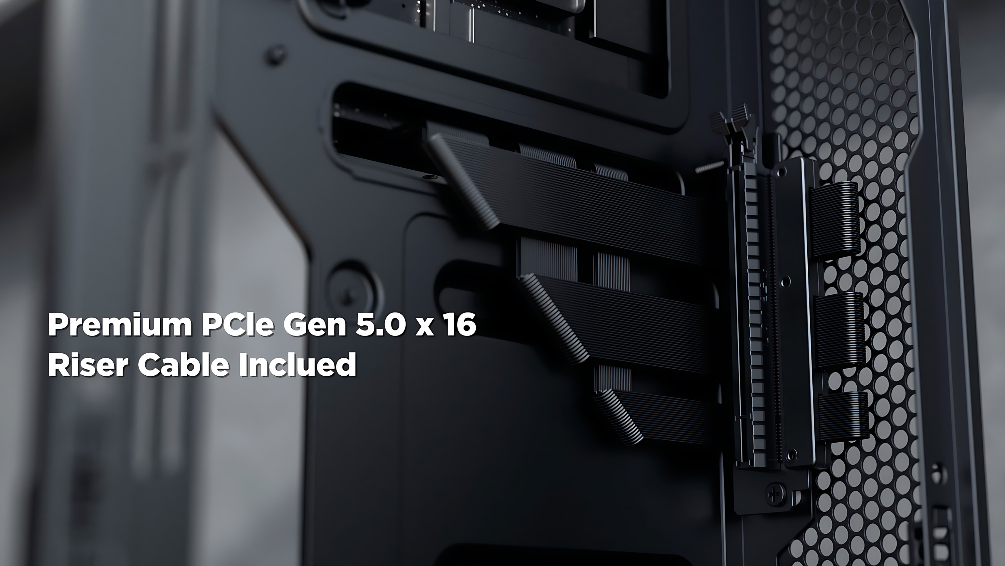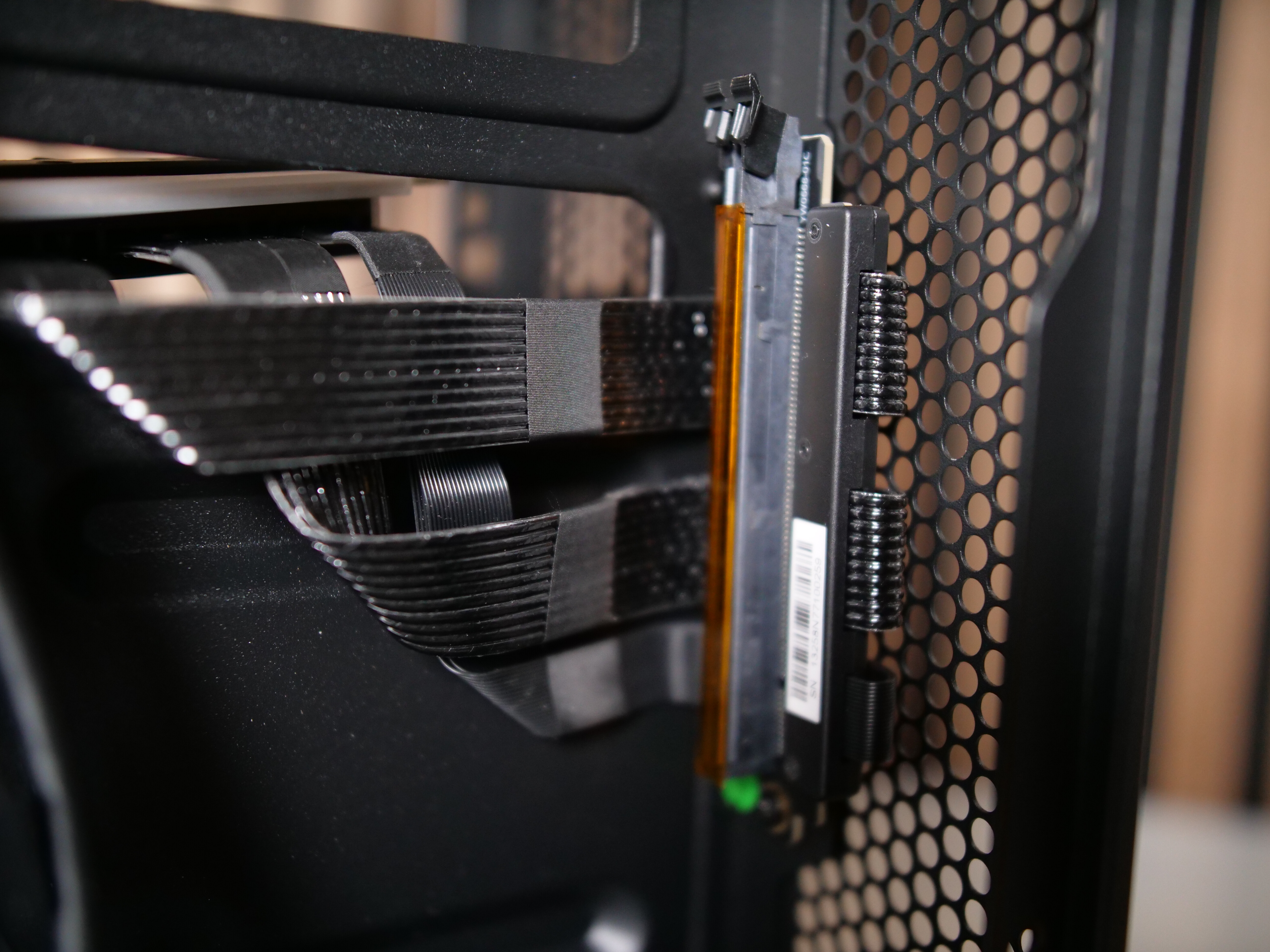 Die Grafikkarte bekommt durch die Riser Verlängerung ihre eigene Kammer und versorgt sich selbst mit Frischluft durch das Mesh-Gitter und der seitlichen, aktiven Belüftung.