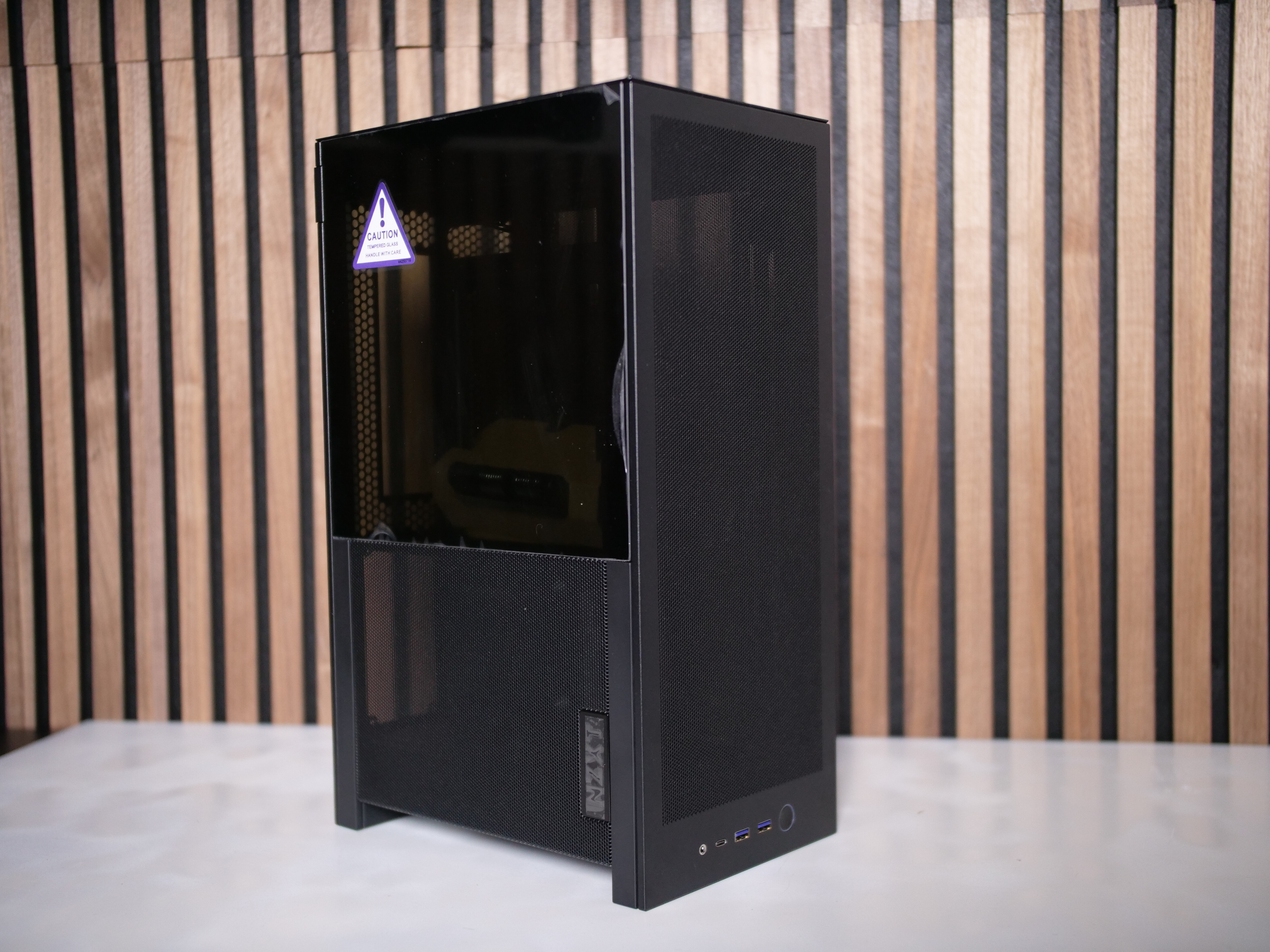 Das knapp 21L Gehäuse ist durchweg mit hochwertigem Stahl und ultra-feinem Mesh-Gitter verarbeitet. Dabei kommt trotz der kleinen Bauform auf ca. 4,5kg Leergewicht. Alle 5 Seitenteile lassen sich Werkzeuglos mit einem leichten klicken entfernen. Hier ist der Mechanismus NZXT-Typisch stabil, aber ohne an den Seitenteilen mit Kraft reißen zu müssen. Die Seitenscheibe ist wie üblich aus temperiertem Glas.