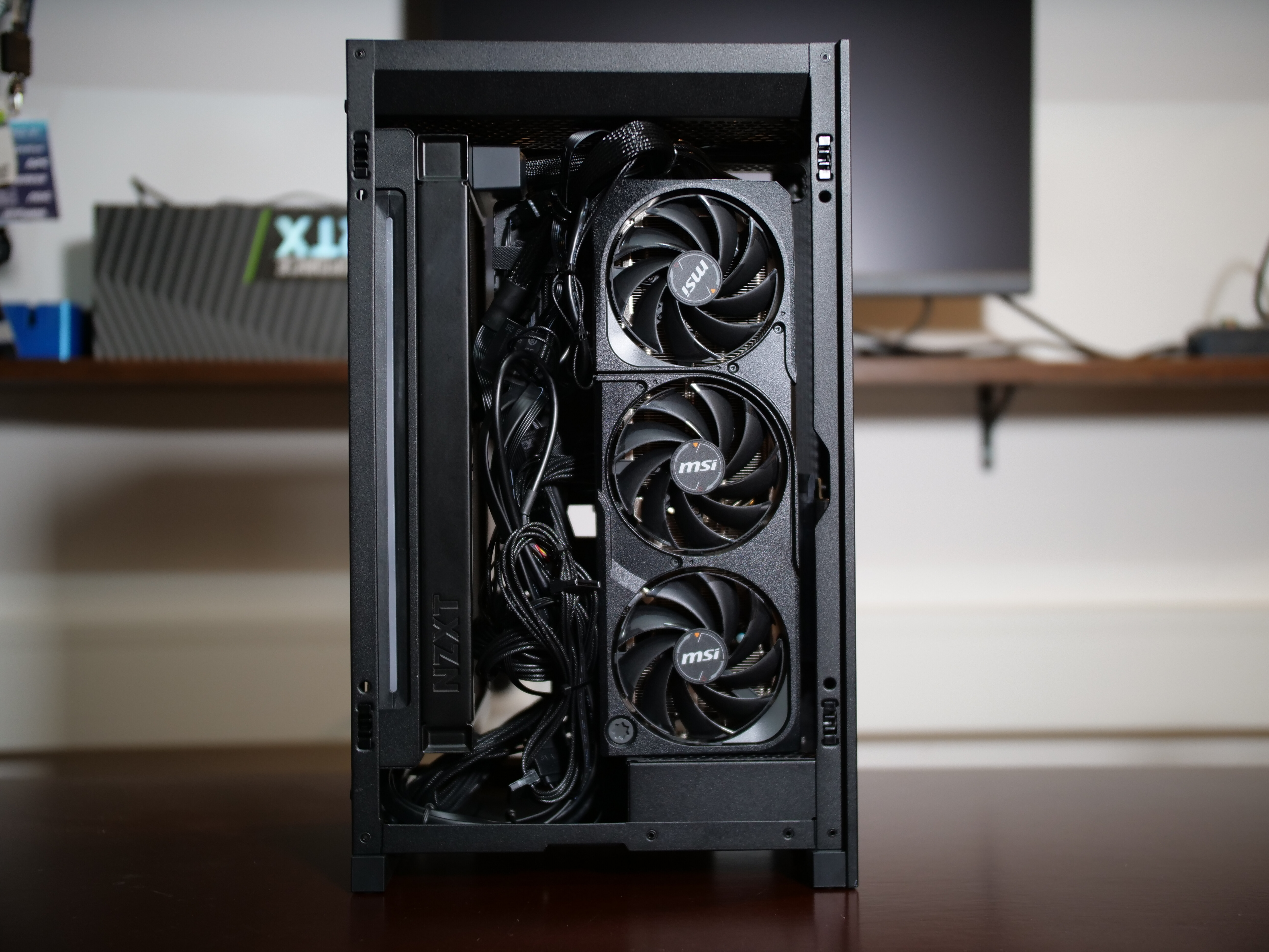 Hier sind maximal 3 Slot GPUs mit einer Länge von 331mm möglich, also fast durchgängig alle aktuellen High-End Karten, wenn auch nicht alle Hersteller Modelle. In meinem Aufbau habe ich die 2-Slot Karte „MSI RTX 5080 Shadow“ mit 303mm Gesamtlänge verwendet und noch ordentlich Luft zu allen Seiten.